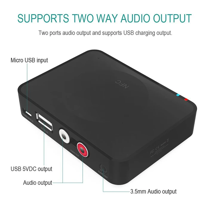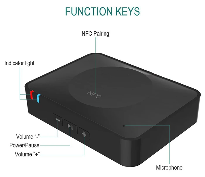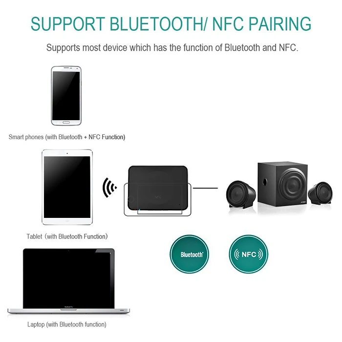 Package Contents:?1 x IBT - 08 NFC Desktop Wireless Bluetooth 3.0 Receiver Adapter with 3.5mm Audio Output Port, 1 x USB Charging Cable, 1 x Audio Cable, 1 x Bilingual User Manual in English and Chinese