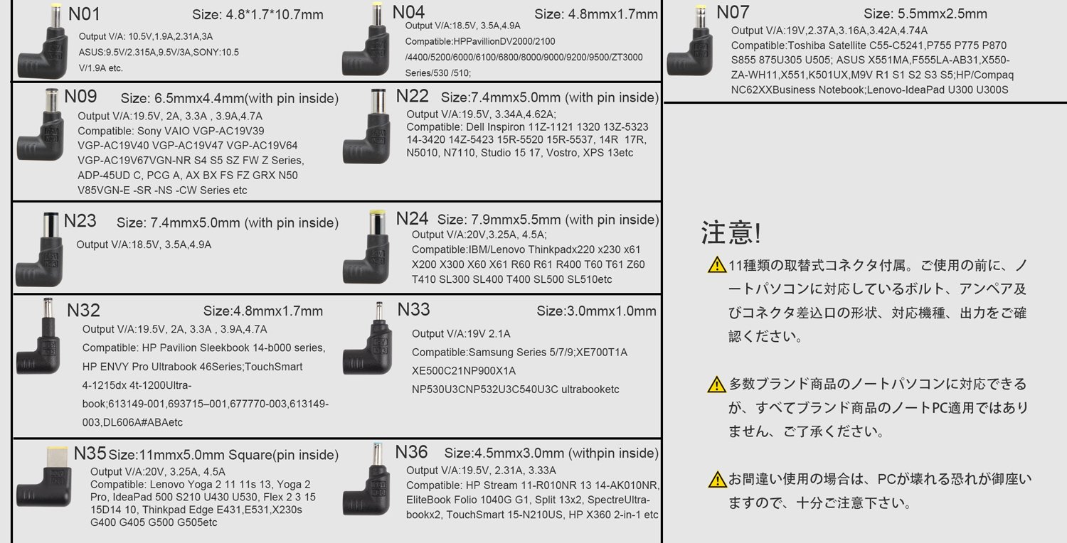 N01 4.8 * 1.7 * 10.7 mm 10.5 V Fit for ASUS: 9.5 V / 2.315 A, 9.5 V / 3A, SONY: 10.5 V / 1.9 A etc.