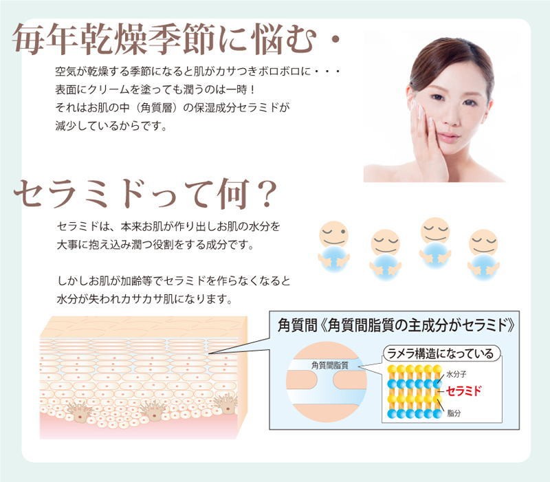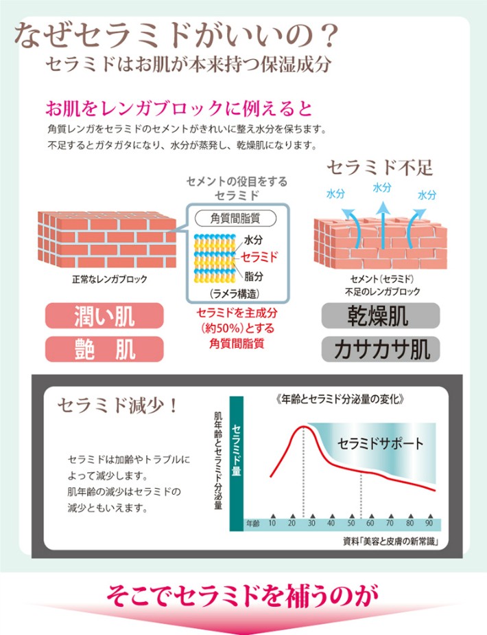 <効能 効果> ◆お肌にうるおいを与え、柔軟性を保ちます。 ◆肌をひきしめ、キメを整えます。 ◆お肌の荒れを防ぎ、皮膚をすこやかに保ちます。 ◆お肌にはりを与えます。 <製品特性> ナノセラミドが角層に浸透して潤いの魅力肌をつくります。
