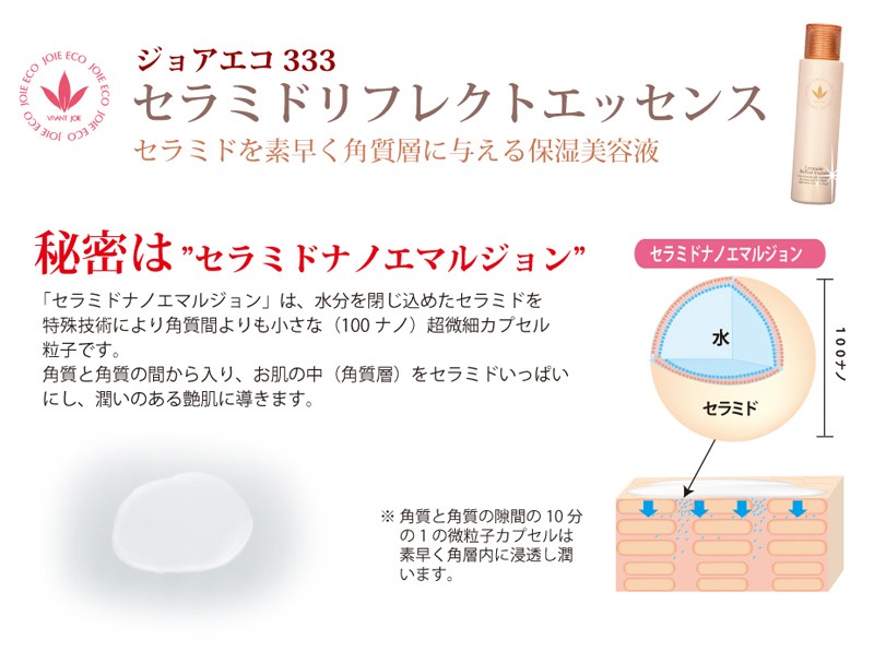 《セラミドリフレクトエッセンス》は粒径100ナノの粒子状になっているため、塗布後角層内のすみずみまで浸透し、角質間を水分、脂分で潤します。 さらに4種のセラミドは、それぞれアルキル基の構造が異なるため、肌表面の反射光(光リフレクト)に乱反射が起こり、肌が一層美しく艶肌に輝きます。 ハトムギ種子エキスが角層の潤いを増し、角質を柔らげ肌荒れを防ぎます。