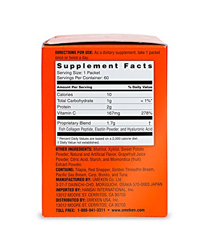 - Umeken Elastin Beauty is a highly functional, edible cosmetic that contains the revolutionary new skin ingredient Elastin, large amounts of high-quality, high-absorbency fish collagen, "moisture tank" hyaluronic acid, and skin-activator Vitamin C.