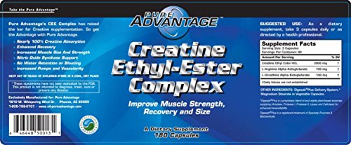 -. Binding : Health and Beauty -. Brand : Pure Advantage -. EAN : 0646448500131 -. Feature : Pure Advantage's Cee Complex Has Raised The Bar For Creatine Supplementation. So Get The Advantage With Pure Adantage. / Nearly 100% Creatine Absorption Enhanced Recovery Increased Muscle Size And Strength Nitric Oxide Synthase Support No Water Retention Or Bloating Increased Pumps And Vascularity -. Label : Pure Advantage -. Manufacturer : Pure Advantage -. MPN : 217648 -. PackageQuantity : 1 -. PartNumber : 217648 -. ProductGroup : Health and Beauty -. ProductTypeName : HEALTH_PERSONAL_CARE -. Publisher : Pure Advantage -. Size : 60 servings -. Studio : Pure Advantage -. Title : Pure Advantage Creatine Ethyl-Ester Complex -. UPC : 646448500131