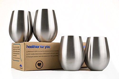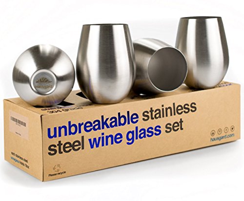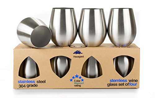 Want: Elegant stainless steel set of 4 wine glasses featuring European inspired design and modern accents? Need: sturdy technology to help reduce risk of ugly stains on your expensive carpets and treasured sofa Desire: Unbreakable stemless tumbler cups made of the finest 304 grade steels for camping, outdoor, travel or nautical use Get: Large reusable 16 oz cups that are BPA free and dishwasher safe ?? These stainless steel tumblers are a perfect alternative to glass. The stem free appearance has been carefully researched by our team of industrial designers to help reduce the risk of your belongings from being destroyed by wine stains. ? They are stylish enough for entertaining at dinner parties, barbecues or picnics and tough enough to take camping or boating.? ? Cleaning is also simple, each set is dishwasher safe and can be included with a regular cycle; no more trying to reach inside the bottom of the cup with your frustrating washing up brush. ? The tumblers are BPA free and guaranteed free of toxic chemicals commonly found in the majority of American drinkware. Eliminate unnecessary risks and enjoy your wine with peace of mind that all Hausgard products meet the highest FDA standards. Lifetime guarantee: Each 16oz cup is unbreakable. If for any reason you are unsatisfied, simply return your purchase to us and we will refund you happily. ADD TO CART 0 |