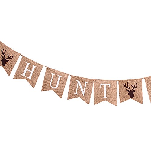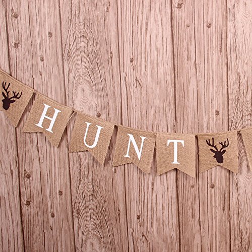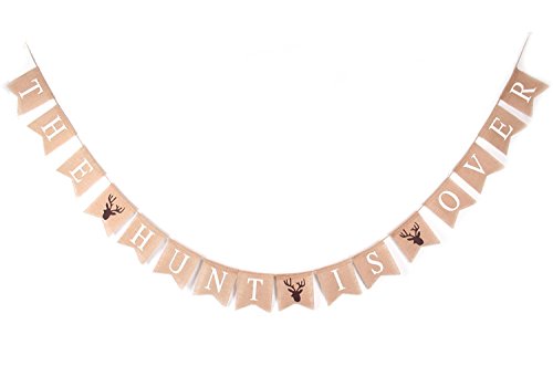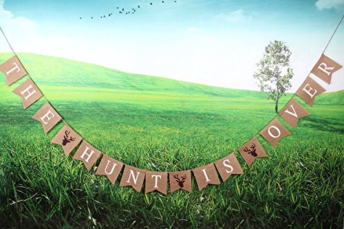 -. Feature : Material: Burlap; Weight: Approx. 110g / Total length: 75 inches long. Each flag size (L * H): Approx. 15 * 13cm/ 6 * 5.1 in / THE HUNT IS OVER' written in all uppercase letters in white.Three brown deer separating words, and easy for recycling use / This bunting banner makes a lovely decoration for animal protection occasion, and create active and joyful atmosphere, make the parties or canivals memorable / Lightweight and easy to hang them on the wall, above the table, in the hallway and on the tree, house etc