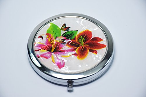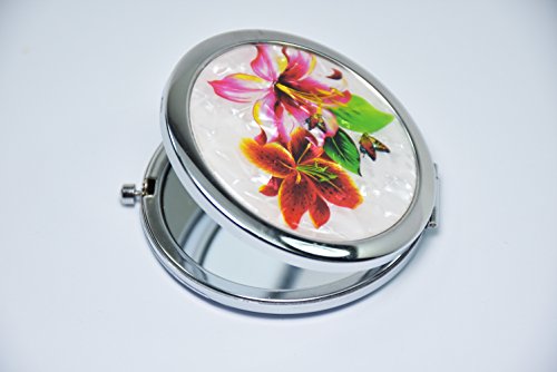 Round Compact Magnifying Make up Double sided Mirror Mother Of Pearl Art Flowers (lily)