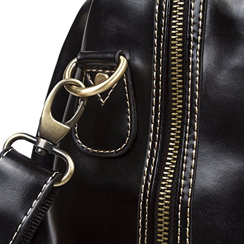 -. Feature : Size: 17.6"L x 8.4"W x 10.5"H. / Material:imported genuine leather.Inner material:cotton lining / Brass&Silver metal hook and buckle make the duffel bag more attractive and durable. / Fit for 14" laptop.contrast stitching,good workmanship. / Removable and adjustable shoulder strap with thickened pad.