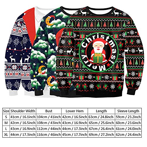 Specification: Item Type: Christmas Sweatshirt Materials: polyester spandex Color: multicolored Optional sizes: S, M, L, XL Package weight:345g Please allow 1-3cm error due to manual measurement. Thank you for your understanding.