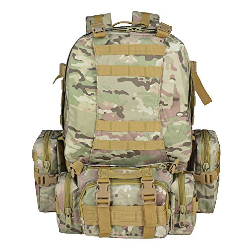 -. Feature : Rugged weather resistant great premium nylon material - Strong big teeth zippers - Durable Buckles for a great long use / Multiple large exterior and interior pockets for organizing storage,the Military Tactical Backpack can put more things you want on the way. / Compatible for pouches and attachments. One main bag with 3 detachable molle pouches attached on the front and two sides. The one front detachable bag can be used as a waist, fanny or shoulder pack.With the two removable side packs, you get more space to configure for your mission / Adjustable shoulder strap, chest belt and hip belt for heaving loading, Great ideal for outdoor activities: camping, hiking, trekking, traveling, etc. / Breathable and Soft Mesh on the back can reduce weight feeling.More breathable mesh backing make you comfortable,keeping the back dry and cool.