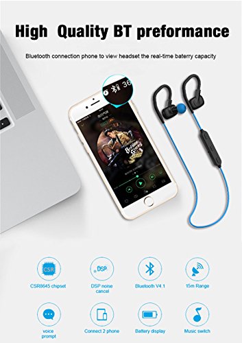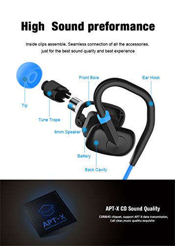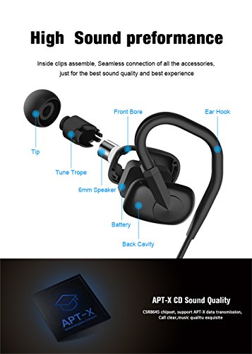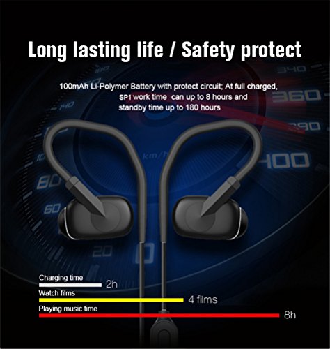 -. Feature : [BLUETOOTH PERFORMANCE]Hight quality BT performance ,build-in CSR 8645 chipset, Support APTX decode , BT version up to V4.1, BT transmission distance up to 50ft, support voice prompt, multi point connect, use HD microphone support CVC 6.0 technology. / [MCRO-SPEAKER]Hight sound quality, 0.24inch mcro-speaker driver size , Frequency range from 20HZ to 20KHZ ,SNR: ¡ò80dB, Distortion: ? 1%. / [TIME]Long playback time, build-in 3.7V/100mA/h Li-battery, playback music up to 8H,standby time 180h, full charge time less then 2h. / [WATER RESISTANT¡ÁIPX 4 waterproof and sweat proof , ensure the safety of headphone. / [SIZE&AFTER-SALES]Comfortable and secure fit, provide couples of eartips and earhooks in different sizes, light and small control box, only one finger control three button and his product is lifetime free warranty
