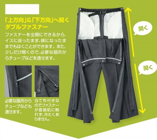 | ファスナーを全開にできるから、イスに座ったまま、横になったままでも履く事ができます。また、少しだけ開く事ができるので、必要な箇所からチューブなどを通せます。 カジュアルなお出かけにぴったりな撥水加工を施した綿混素材のパンツです。 |