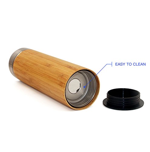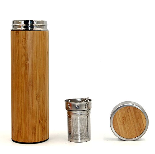 1, Tumbler is 17oz, inner is made of 18/8 food grade stainless steel, vacuum, outer is made of real bamboo, stylish look 2, Our tumbler can keep hot 12hours, keep cold more than 24 hours, 3, Food grade material, no harmful plastic, leak-proof, 4, tea infuser and strainer, brew your favorite loose leaf tea, use it as a fruit infuser water bottle or even brew herbal beverages!Feature