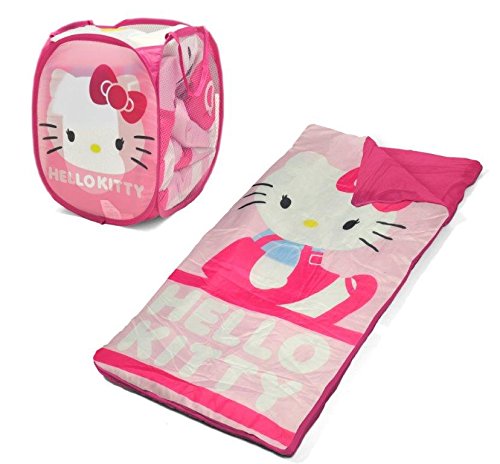 Brighten any sleepover or party with the Hello Kitty Slumber Bag with Bonus Hamper. Perfect for any Hello Kitty fan, the slumber bag features bright designs of Hello Kitty. The 30" x 54" sleeping bag is 100% polyester and machine washable. The set includes a bonus hamper that is perfect for storing just about anything.Feature