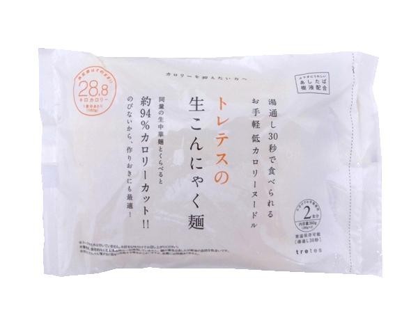 | インドネシアに自生する「ムカゴこんにゃく芋」でつくった「トレテスの生こんにゃく麺」。無農薬で栽培されたあしたばの樹液を配合しているのが特長です。同量の生中華麺と比べると、約94%カロリーカット!!のびないから冷たい麺、温かい麺から焼きそば・パスタのような炒め料理にも相性抜群です。 |