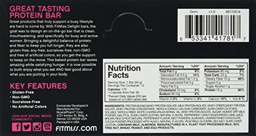 ReleaseDate : 2016-11-01 Studio : Fitmiss Publisher : Fitmiss Binding : Health and Beauty Product Description FitMiss Delight Baked High Protein Bar is a great tasting product that truly supports a busy lifestyle. With FitMiss Delight bars, the goal was to design an on-the-go bar that is clean, mouthwatering, and specifically for busy and active women. Bringing a delightful balance of protein and fiber to keep you full longer, they are also gluten-free, soy-free, sucralose-free, non-GMO and free of artificial colors, so you get the support to keep on the move. This baked protein bar tastes amazing while satisfying hunger. It is now possible to both enjoy what you eat AND feel good about what you are putting in your body. 0