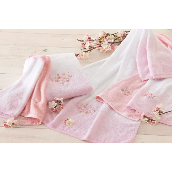 ●「桜の花びら」から採ったさくら色をもちい、山を染める淡いグラデーションをタオルに表現しました。「伝統」と「技術」が融合した日本の心の色をお楽しみください。