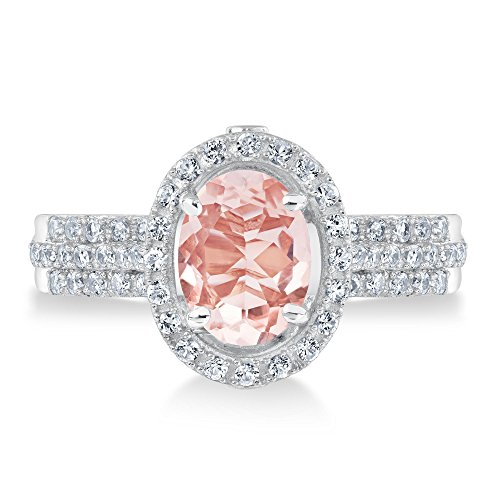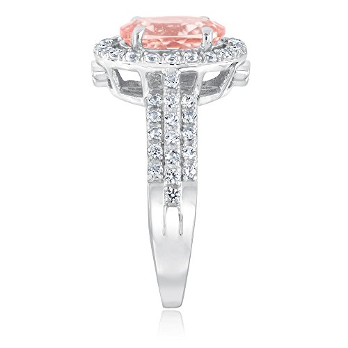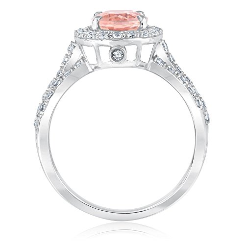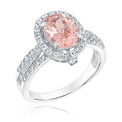 This sterling silver ring features a 9x7mm oval peach beryl morganite in the center surrounded by 1.25mm round created white sapphires. Seventeen 1.25mm round created white sapphires adorn each shoulder. This ring also features one round diamond on the front and one on the back. Ring is 13mm at the top and 2mm at the bottom.