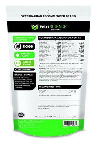 -. Feature : Canine Plus Senior is formulated for the nutritional needs of mature dogs, with a balance of amino acids, fish oil omegas and B vitamins. / Canine Plus Senior is recommended for geriatric dogs to support heart, liver, brain and eye function as well as physical and mental well-being / Canine Plus(TM) Senior incorporates over 25 balanced ingredients that are not found in most dog foods or ordinary multivitamin supplements. / Each vegetable flavored soft chew provides vital minerals that support proper composition of body fluids, bone structure and helps to maintain healthy nerve function and cognitive health. / VetriScience products are manufactured in the U.S.A. and are backed by a 100% Satisfaction Guarantee.