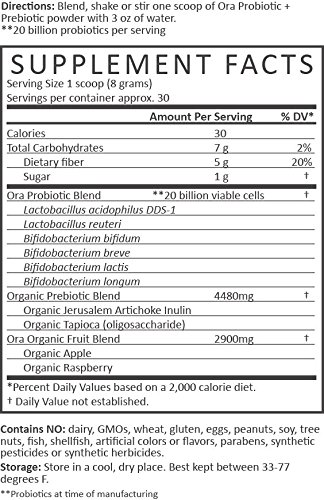 -. Feature : ORGANIC PROBIOTICS WITH PREBIOTICS - Ora's Probiotic Powder is independently certified USDA Organic Certified Probiotic. It's 100% vegan and free of GMO's, gluten, dairy and soy. / 20 BILLION CFUS, 6 STRAINS - Our Organic Probiotics with Prebiotics are packed with probiotic punch! Every serving contains over 20 Billion CFUs, and 6 unique strains that have been known to combat vaginal infections such as Candida, play an important role in the development and maintenance of a healthy immune system, and help fight off harmful foreign bacteria that may be introduced through sudden changes in environment or diet. / DAIRY FREE, SOY FREE, GLUTEN FREE, YEAST FREE, NON GMO - like active dry yeast used in baking, our probiotics are freeze dried to keep them active without refrigeration. Our probiotics are vegan, major allergen free, free of GMO's and have chef approved flavor so it's great for children. / CHEF DESIGNED APPLE & RASPBERRY FLAVOR - no sugar added, this chef designed probiotic powder mixes well with water, plant-based milk or your favorite beverage. Great for kids! / 30 DAY SUPPLY, 5g OF ORGANIC FIBER IN EVERY SERVING (20% of your daily fiber needs) - our prebiotic fiber comes from organic Jerusalem artichoke and organic tapioca; prebiotics are the fuel probiotics need to thrive.