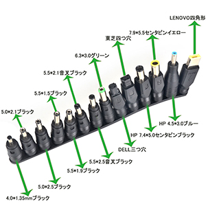 ①5V/9V/12V/15V/16V/19V/19.5V/20V/24V 9種の出力電圧を選択できます、38種類変換プラグ付きで、ほぼ全てノートパソコンに適用する。