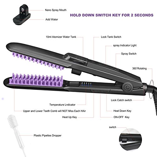 - ★ANION CARE and ANTI-SCALD DESIGN: 30 seconds while the speed of hot and then add fog of water, let that steam hair straight comb user directly reached to the physical straight hair effect. Release rich negative ions when straightening and shining curly or frizzy hair, eliminating frizz and adds shine, reducing knots and split ends, make your hair not only straight but also smoother healthier