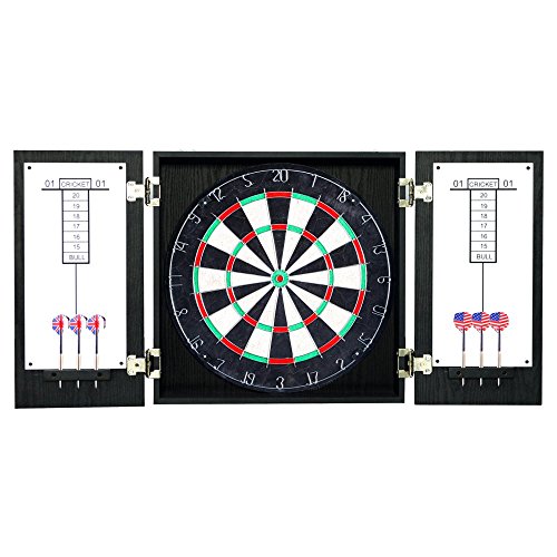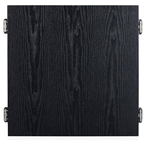 -. Feature : Cabinet dimensions: 19.75-in W x 3.75-in D x 19.75-in H / 18-in regulation sisal fiber self-healing dartboard / Constructed of CARB certified MDF material covered in a handsome black melamine laminate / Staple-free bulls-eye and removable number ring for prolonged dart board life / Includes 2 sets of steel tipped darts
