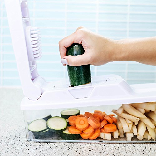 QUICKLY SLICE YOUR FRUIT, VEGGIES, AND CHEESE SAFELY INTO A CATCHING CONTAINER – Insert cutting grid into the slicer cutter chopper and USE THE *FINGER GUARD* to hold the food while slicing pieces into the collection container.
