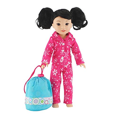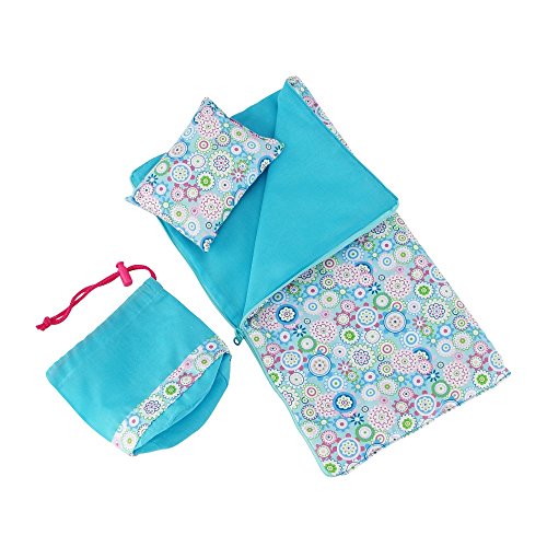 Sleepover anyone? Your 14 inch doll will be ready to go with this colorful blue, pink, green and white geometric flowered sleeping bag set! This awesome and unique collection includes a super-comfy reversible sleeping bag, large fluffy flowered pillow and functional drawstring carry bag. Your 14" doll will the envy of her friends, and the hit of the sleepover! *Doll Not Included* *Bed Not Included*Feature
