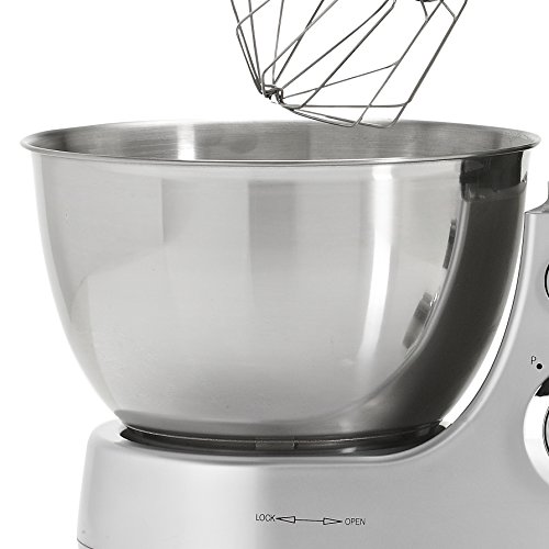 -. Feature : Edelstahlschüssel / Silberfarbenes Gehäuse / Pulsschalter / Verschließbar mit Sicherheitsverschluss Mechanismus / Knethaken / Quirl / Teflon beschichteter Quirl; Inhalt: 4.5 L; Transparenter Deckel; Deckel mit Nachfüllöffnung; Deckel mit Sicherheitsverschluss; Zum Reinigen einfach auseinanderzunehmen; Spülmaschinenfestes Zubehör; AntiRutschFüße; Abnehmbarer Deckel