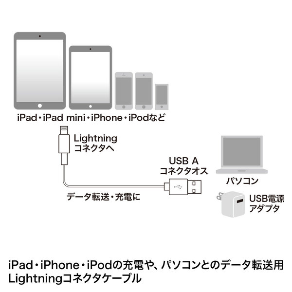 ●iPhone7/7Plus、10.5インチ/12.9インチiPadPro、9.7インチiPad、iPadmini4、iPodtouch(第6世代)などに対応したLightningUSBケーブルです。