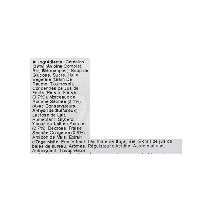 원재료:전입오토맥,미,전입밀,포도당액당,설탕,식물성 기름,농축 과즙(포도,딸기)고, 말림 사과,유당,요구르트 파우더,포도당,밀 배아,식염,보존료(이산화유황)고, 글리세린,유화 제(대두 유래)고, L 다《―베리》색소,향료,Ph조정 제,산화 방지제(V.E)