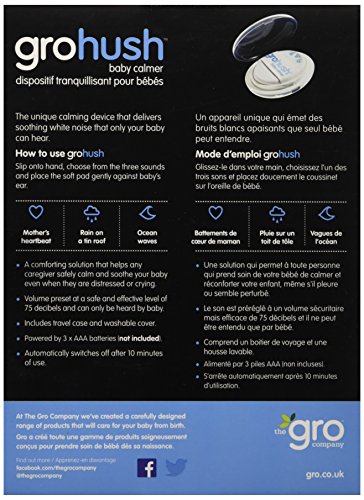-. Binding : Baby Product -. Color : Silver -. EAN : 5055653732629 -. Feature : The unique calming device that safely delivers soothing white noise directly to your baby / a comforting solution that helps any caregiver safely calm and soothe your baby even when they are distressed or crying / Volume preset at a safe and effective level of 75 decibels and can only be heard by baby / Suitable for use from birth / Volume is preset to save sound levels and cannot be changed -. Label : Baby Cribs -. Manufacturer : Baby Cribs -. Model : HBB203 -. MPN : HBB203 -. PackageQuantity : 1 -. PartNumber : HBB203 -. ProductGroup : Baby Product -. ProductTypeName : BABY_PRODUCT -. Publisher : Baby Cribs -. Studio : Baby Cribs -. Title : Grohush-Baby Calmer-Soothing white noise