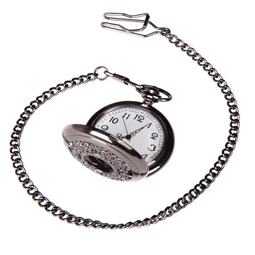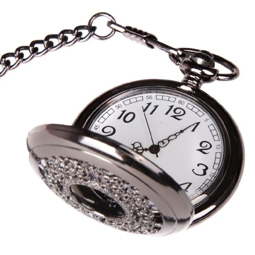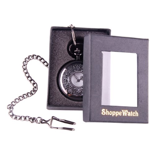 -. Feature : Half Hunter Pocket Watch with a Silvery Black Tone Metal Case / ShoppeWatch Brand with Gift Box / Metal Chain Length 365mm (14 inches) / White Dial with Arabic Numerals