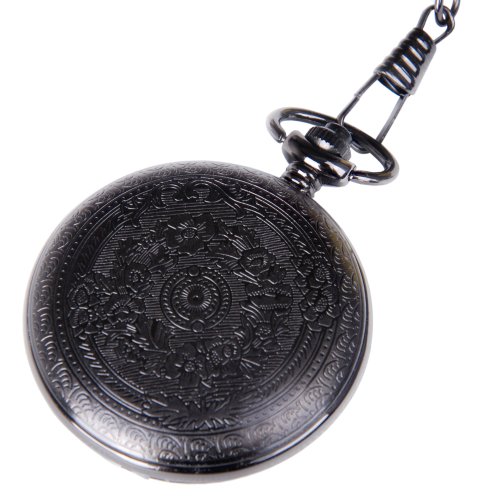 -. Title : Pocket Watch Black Case White Dial with Chain Half Hunter Neo Vintage Steampunk Design Cosplay PW-22