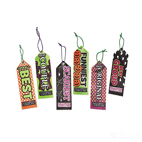 HALLOWEEN COSTUME AWARD RIBBONS: Halloween costume party prizes don't have to be anything pricey! These Halloween Costume Award Ribbons are sure to make all your ghouls and goblins feel like a winner! Hand out these polyester awards for "Overall Best", "Best Couple", "Best Group", "Scariest", "Funniest", and "Most Original"!