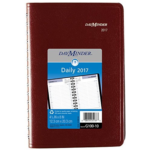 -. Binding : Office Product -. Brand : DayMinder -. EAN : 0038576251373 -. Feature : Monthly planner has simulated leather cover in assorted colors (Black and Burgundy). Please note color choice is not available to customer, the color will be selected at random for you. / Quarter-hourly appointment times from 7:00 a.m. - 7:45 p.m. / One weekday per page; Current and future months reference -. Label : ACCO Brands -. Manufacturer : ACCO Brands -. Model : G10010 -. MPN : G10010 -. NumberOfItems : 1 -. PackageQuantity : 1 -. PartNumber : G10010 -. ProductGroup : Office Product -. ProductTypeName : OFFICE_PRODUCTS -. Publisher : ACCO Brands -. Studio : ACCO Brands -. Title : DayMinder Daily Appointment Book / Planner 2017, 4-7/8 x 8", Color Selected For You May Vary (G100-10) -. UPC : 038576251373
