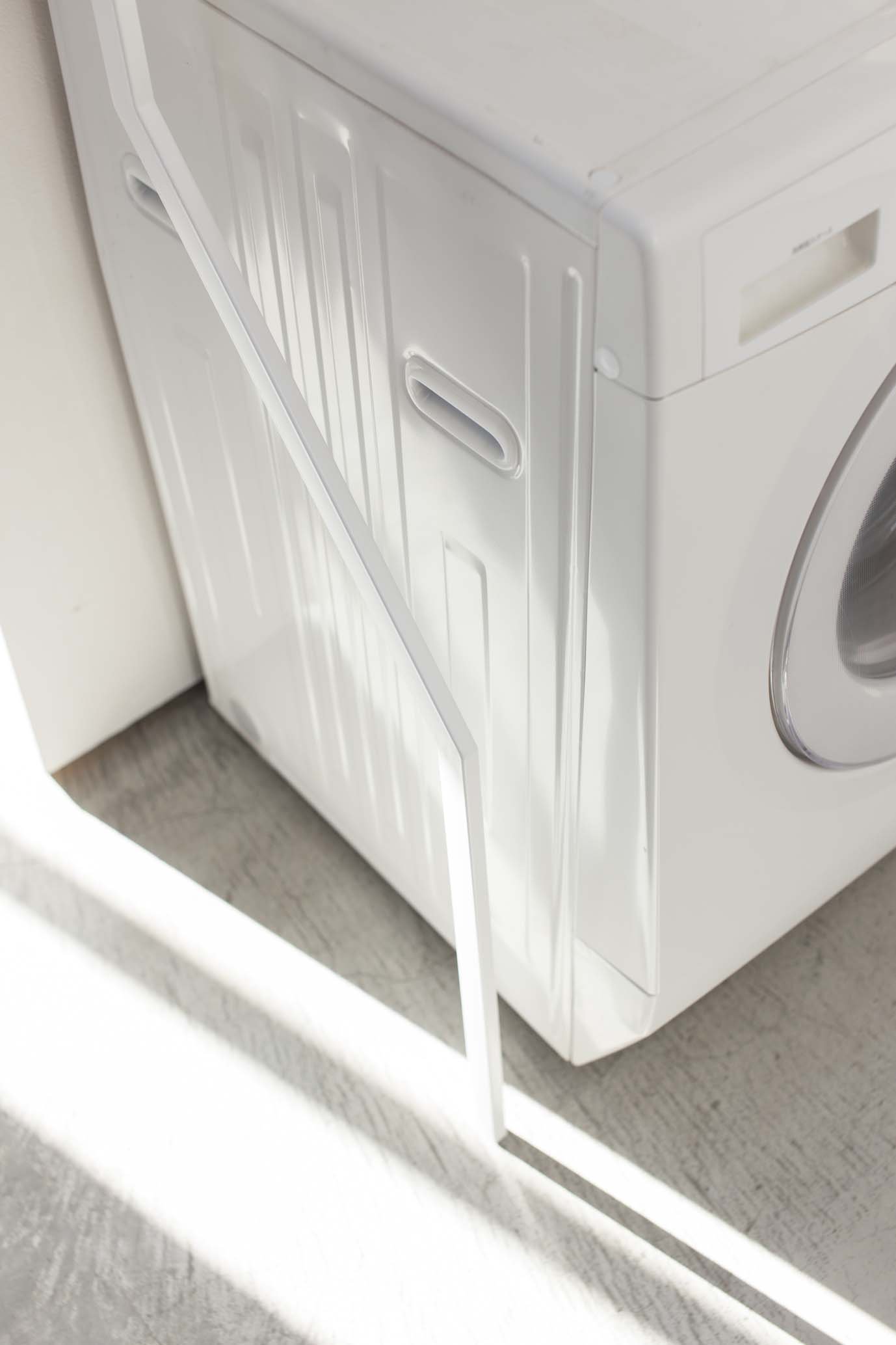A laundry shelf just leaning against the wall.