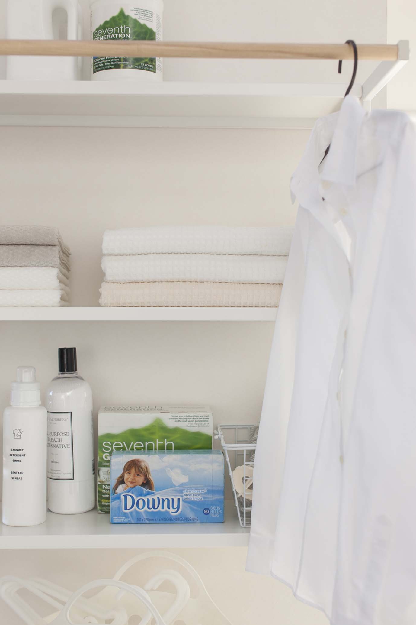 The top shelf has a convenient hanger bar for temporary drying.
