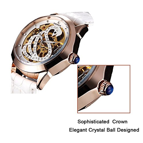 -. Feature : Automatic mechanical movement(Daily use, magnetic field / temperature and impact will affect the accuracy of the watch, manual adjustment can reduce the deviation) / Elegant fashion appearance,Diamond and Swan Dial Skeleton Design,Beautiful glass back,Insight into the mechanical work movement. / Stainless steel case, (length / width / height) Size: 38 / 38 / 13mm / Water resistant to 1 ATM, suitable for light spay, perspiration and light rain / Package includes: 1 x Mechanical watches, 1 x Operation Manual,1 x Carrie Hughes Blue Gift Box(Carrie Hughes Brand gift box package The best gift to a family or friend)