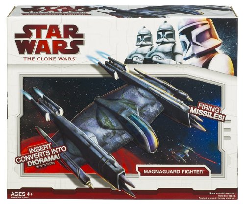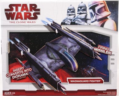 -. Binding : Toy -. Brand : Star Wars -. Color : Gray -. EAN : 0653569442684 -. Feature : Awesome fighter vehicle, as seen in the animated series / Features an opening cockpit, retractable landing gear, positionable thrusters / And firing "missiles" for all kinds of galactic excitement / Package insert converts into diorama / Vehicle comes with projectile accessories and instructions -. Label : Hasbro -. Manufacturer : Hasbro -. Model : 87969 -. MPN : 87969 -. PackageQuantity : 1 -. PartNumber : 87969 -. ProductGroup : Toy -. ProductTypeName : TOYS_AND_GAMES -. Publisher : Hasbro -. Size : Standard -. SKU : 87969 -. Studio : Hasbro -. Title : Star Wars Clone Wars Star Fighter Vehicle - Magna Guard Fighter -. UPC : 653569442684