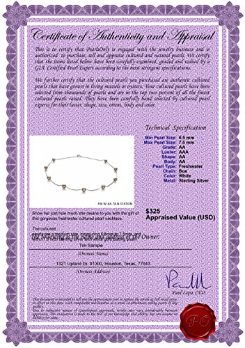 Included FREE with your cultured pearls necklace is an Appraisal Certificate prepared by a Pearl Expert describing in detail your necklace size, color and body shape. A color picture of your necklace is shown on each certificate to ensure carefree insurance claims should those ever arise. It is a wonderful keepsake that shows you truly care.