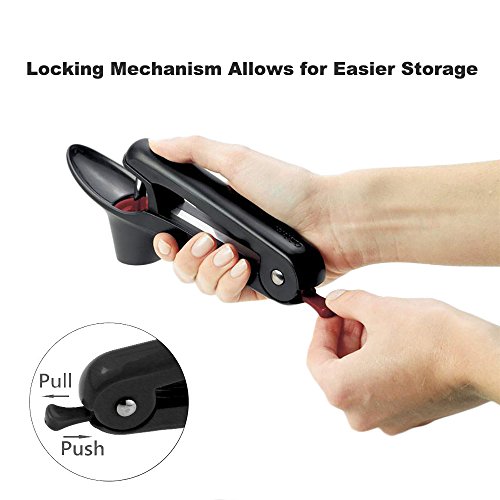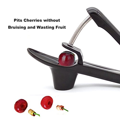 How it works the EnTeck Professional Cherry Pitter Tool? 1. Press handles and push locking latch to unlock pitter 2. Cherry in place and start stoning the cherry 3. Collecting pitted cherry through the spoon- shaped holder 4. Pull the locking latch to lock pitter after use