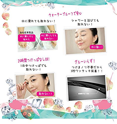 -. Feature : 水にぬれても取れない!ウォータープルーフで安心 / グルーいらず!つけまノリ不要だから、3秒ワンタッチ装着 / 24時間つけっぱなしOK!1日中つけっぱでも取れない