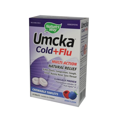 Studio : Natures Way Publisher : Natures Way Binding : Grocery Product Description Natures Way Umcka Cold plus Flu Chewable, Berry Flavored, 20 Chewable Tablets. Pack of 1. Clinically tested Umcka plus Alpha CF combined into one complete, multi-action cold and flu formula: (Pelargonium sidoides 1X) shortens duration and reduces severity of cold, nasal, throat and bronchial irritations. ALPHA CF (Aconitum napellus 4X, Bryonia alba 4X, Eucalyptus globulus 2X, Eupatorium perfoliatum 6X, Gelsemium sempervirens 4X, Ipecacuanha 3X and Phosphorus 6X) provides multi-symptom relief of colds and flu. 0
