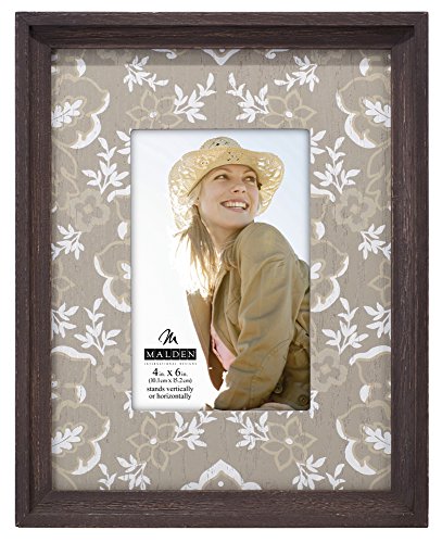 Malden International Designs Rustic Distressed Wood Fashion Loma Picture Frame with Silkscreened Floral Wood Mat Picture Frame, 4x6, Brown
