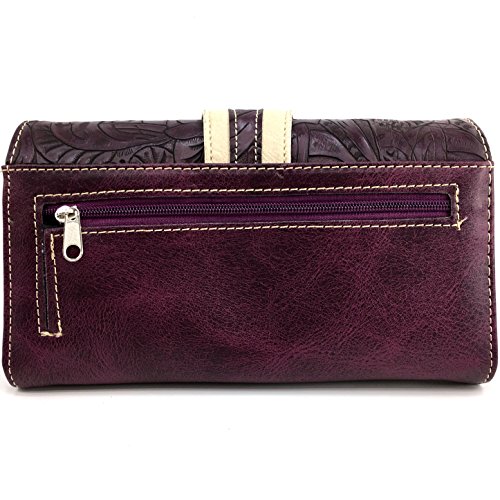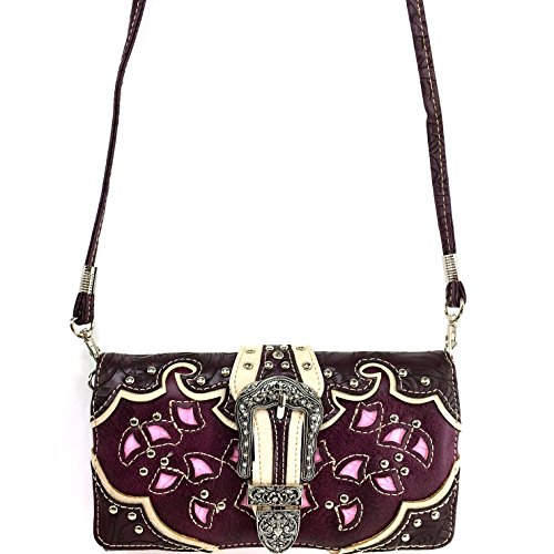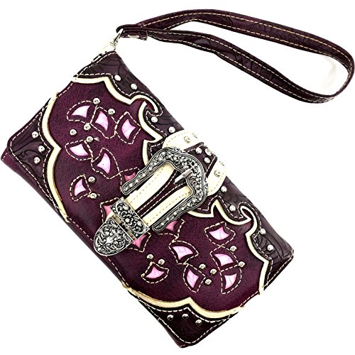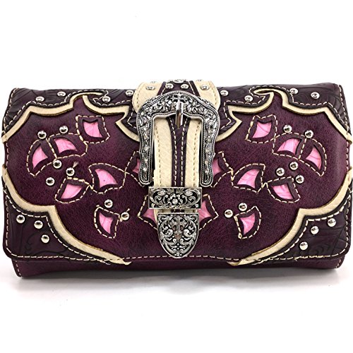 -. Feature : Beautiful Western Tooled Laser Cut Design / Rhinestone Silver Buckle Studded Wallet - Proudly Designed in the United States / Convenient Wristlet Handling and Long Shoulder Strap / Multiple Interior Size Pockets and Storage / Expandable Exterior Coin Pouch With Zipper Closure