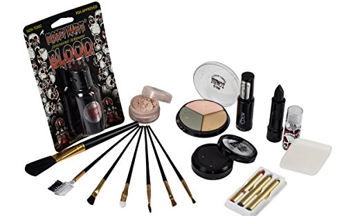 - ALL YOU NEED INCLUDED IN A KIT: This amazing bride of Frankenstein makeup kit includes all you need! Use the black lipstick, the black eyeshadow, the FX foundation, the FX blood, the 3 FX makeup crayons, the setting powder, the deluxe application sponge and the 4 piece brush kit to achieve the perfect makeup result and give your family and friends the fright of their lives!