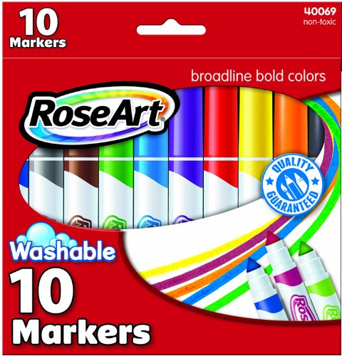 Product Description These Bold Washable Broadline Markers offer a great variety of bold colors to choose from with tips that can draw board or fine lines to make any coloring project bright and fun. The washable formula allows the ink to wash off of most household surfaces, fabrics and skin with mild soap and warm water. Vibrant colors lay down lots of great color without bleeding through your page! They are great for all of your child's coloring needs and are ideal for school or home use. There are 10 colors per pack. Ideal for children ages 3 and up. RoseArt inspires creativity through fun and easy-to-use arts and crafts products sold at family-friendly values. 0