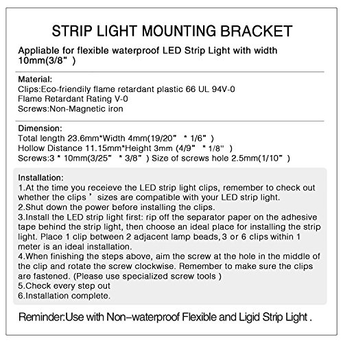 Quantity: 100 pieces of mounting bracket clips and 100 pieces of screws, enough quantity for you to use, can be fixed easily, keep the LED strip steady and secure