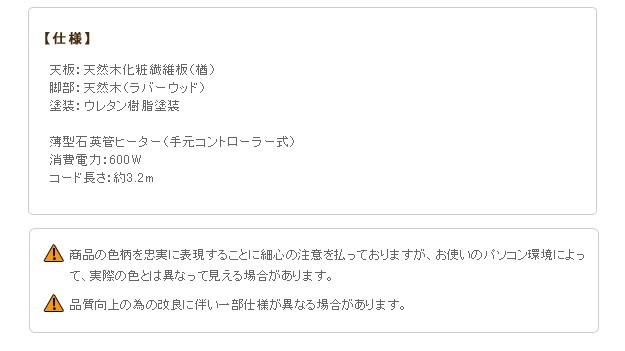 ●商品について:シンプルなデザインのこたつテーブル。どっしりとした太い脚に、厚めの天板。がっしりとした安定感のあるつくりになってます。こたつもテーブルもこれ1台でOK♪薄型石英管ヒーター(手元コントローラー式)。便利な継ぎ脚付(高さ5cm)。