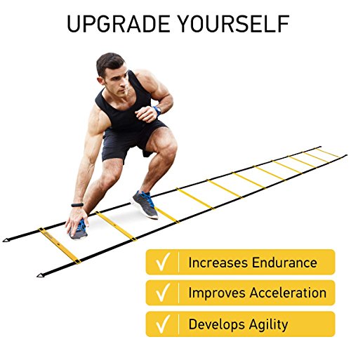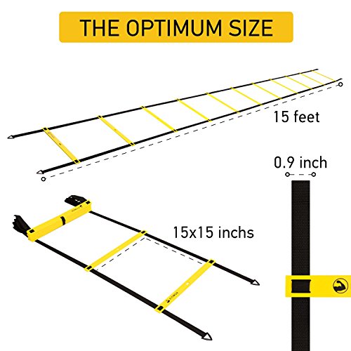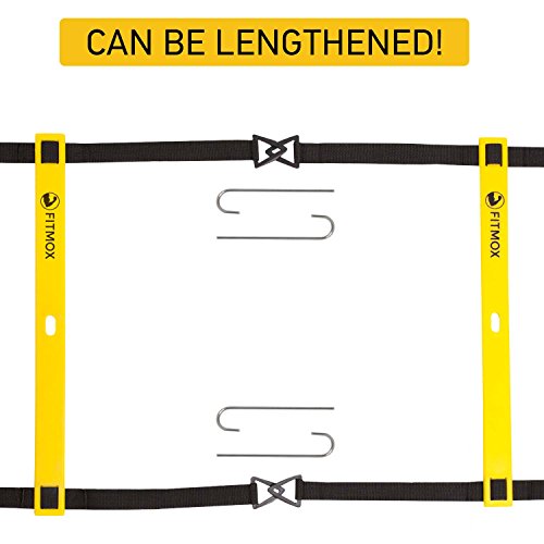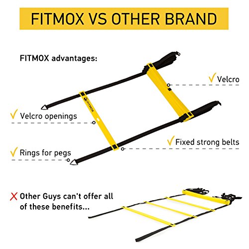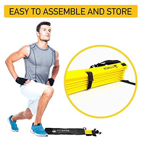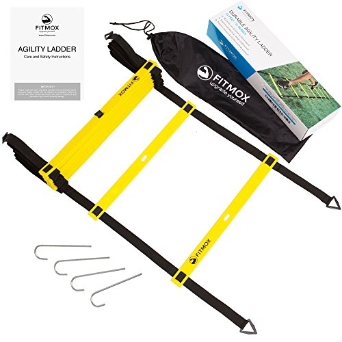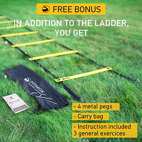 -. Binding : Misc. -. Brand : FITMOX -. Color : Yellow -. EAN : 0638455886421 -. Feature : IDEAL SIZE - Perfect for Agility Ladder Training for all age groups! Designed with optimum rung interval. / ALL YOU NEED - Includes all you need: 4 pegs, sturdy carry bag, instructions, and the 3 most effective exercises! / EASY TO SET UP - just unfold and start your workout! Save valuable time on set up and breakdown of your sessions! / 100% SAFE - Firmly secure the Agility Ladder on any flat surface with metal pegs. ZERO risk of slipping or getting stuck. / TOP QUALITY - Made of high quality PP material, so your Speed Ladder will last you for years to come! -. IsAutographed : 0 -. IsMemorabilia : 0 -. Label : FITMOX -. Manufacturer : FITMOX -. PackageQuantity : 1 -. ProductGroup : Sports -. ProductTypeName : SPORTING_GOODS -. Publisher : FITMOX -. Size : 15 feet -. Studio : FITMOX -. Title : Fitmox 15 ft / 11 Rung Agility Ladder - Plus Bonuses: Best Exercise Programs and Carry Bag - Comes with 4 Durable Metal Pegs -. UPC : 638455886421